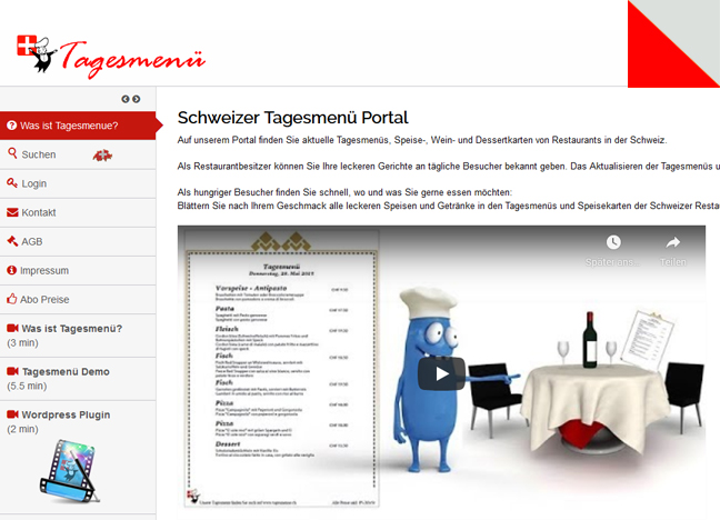 Tagesmenü PortalAuf unserem Portal finden Sie aktuelle Tagesmenüs, Speise-, Wein- und Dessertkarten von Restaurants in der Schweiz.Als Restaurantbesitzer können Sie Ihre leckeren Gerichte an tägliche Besucher bekannt geben. Das Aktualisieren der Tagesmenüs und Speisekarten ist sehr einfach und braucht nur wenige Minuten!tagesmenue.ch